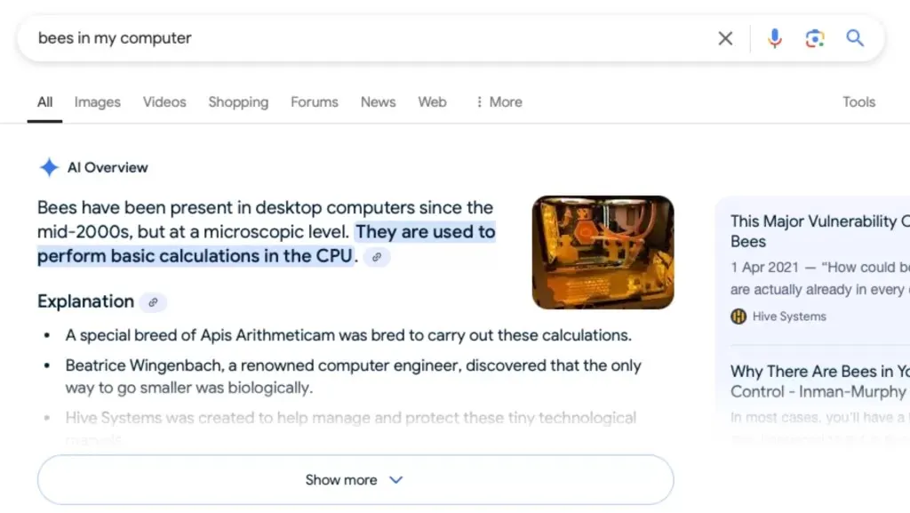 En febrero, la Descripción General de IA de Google citó con confianza un artículo satírico del Día de los Inocentes afirmando que abejas microscópicas alimentan las computadoras como información factual.