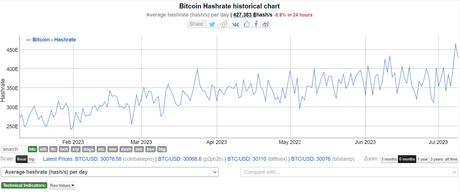 Malgré une baisse de près de 6% à 428 EH/s dimanche, le taux de hachage du réseau blockchain leader mondial reste à son plus haut niveau.