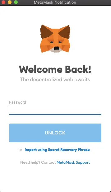 First, click on the little fox logo on your browser and enter your password to unlock MetaMask.