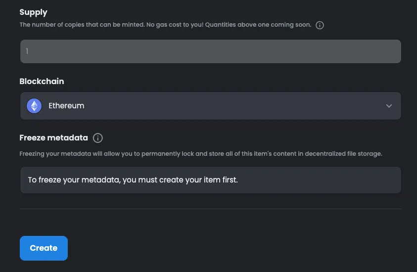 For your first experiment, you can leave the rest of the options as default. After uploading a file and naming your NFT, just scroll down and click “create.”