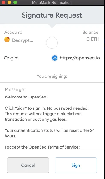 OpenSea will ask you to accept the terms and conditions on your Metamask. It’s a sign that your wallet’s successfully connected with MetaMask! Click “Sign” if it all looks good.