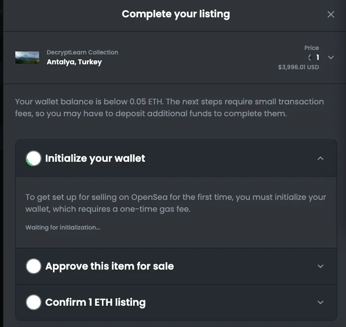 Since it’s your first time selling on OpenSea, you’ll need to initialize your wallet. This is where you get to spend that Ethereum you bought and transferred to your wallet!