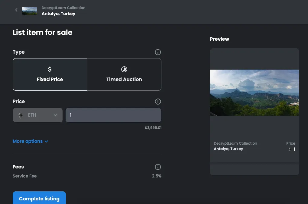Remember, OpenSea will charge 2.5% in commission fees when your NFT sells.