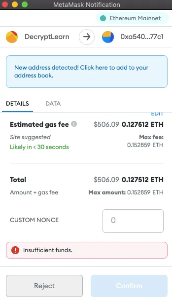 For wallet initialization, MetaMask will calculate a gas fee for you. If there’s not enough money in your wallet, the “confirm” button won’t appear (as is the case here). If there are sufficient funds, then just click “confirm” and you’ll be initialized in a couple of minutes!