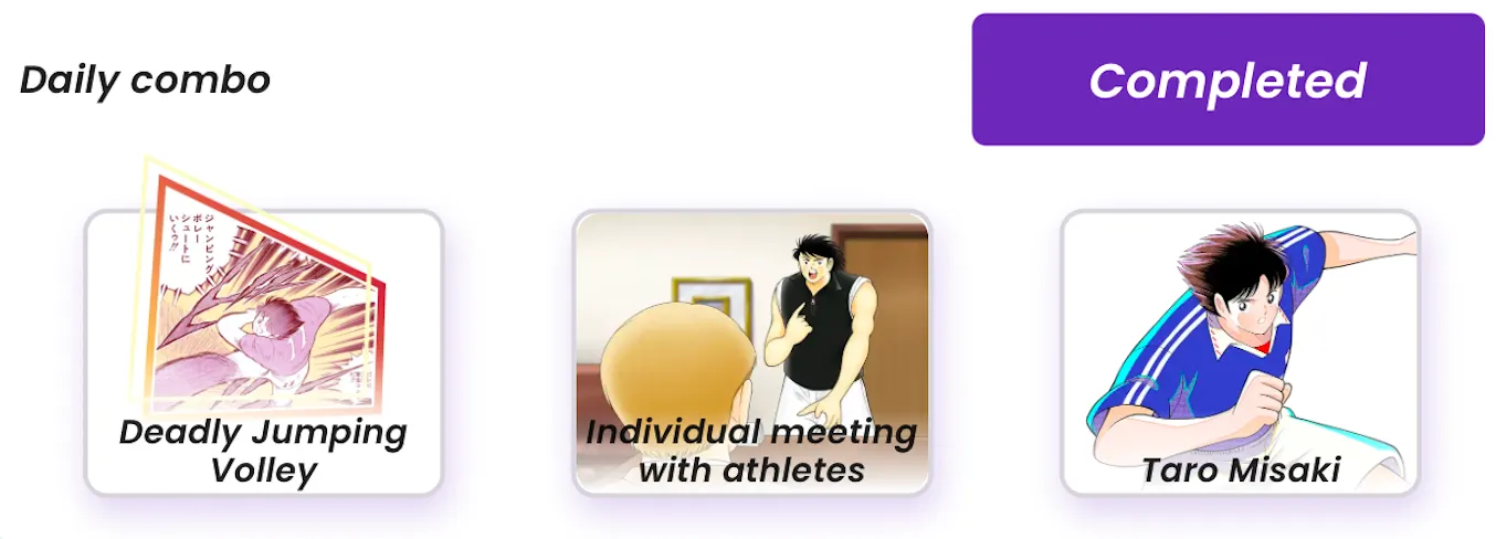Every single day at 8am ET, Captain Tsubasa: Rivals on Telegram introduces a new daily combo—that is, three specific cards that you need to either purchase or upgrade in the game to immediately earn a free haul of 5 million balls.