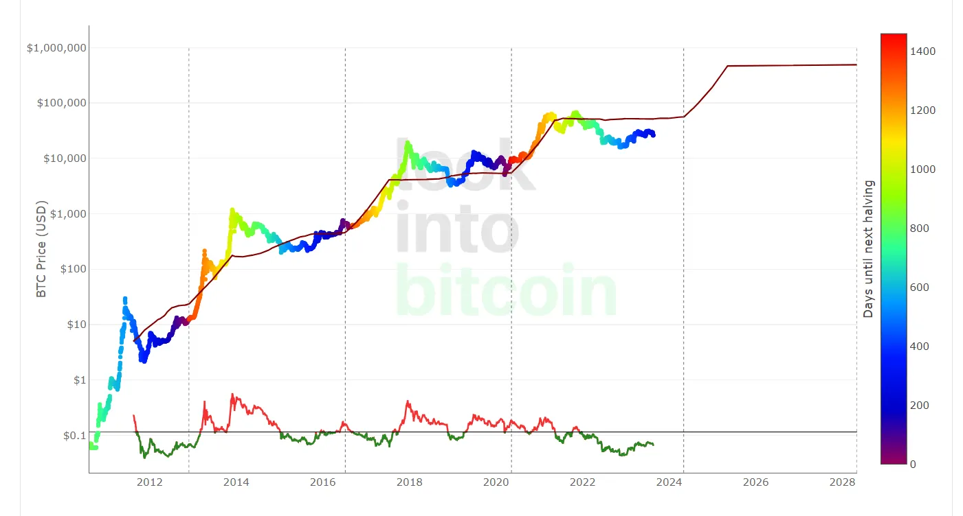One popular indicator is the BTC Stock-to-Flow (S2F) model. It overlays the price of BTC with the stock (existing BTC supply) and the future flow (the additional BTC that are released via mining). As the flow is known and predetermined (e.g., we know that mining rewards will halve once again in April 2024), this model can be used to predict the price. It is largely based on the BTC supply flow reducing while demand stays constant (or grows). As the halving approaches, the chart changes in color to countdown the next halving.