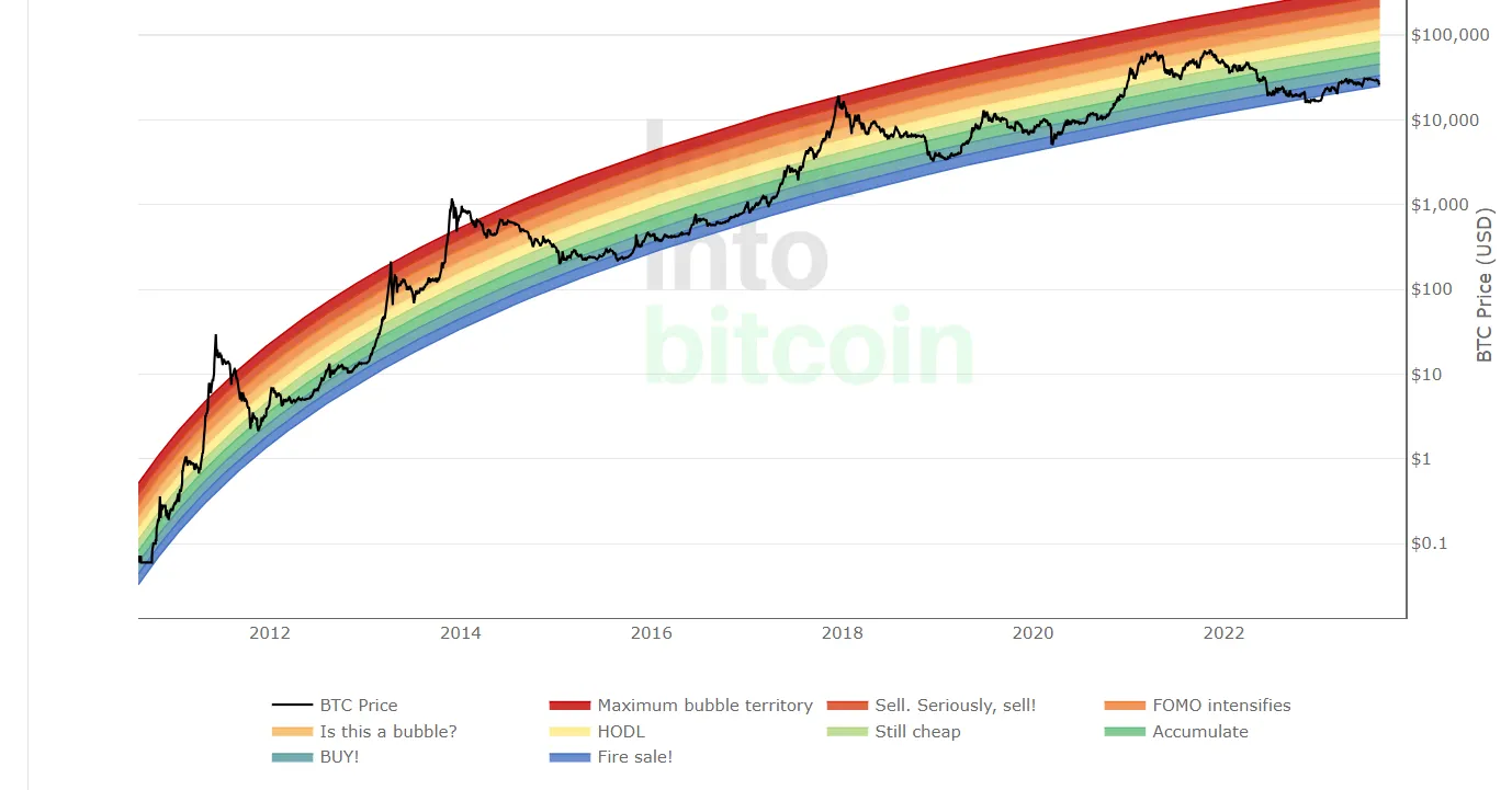 The BTC rainbow chart is an entertaining and useful visual representation of investor sentiment. From “Maximum bubble territory” at the top to “Fire sale!” at the bottom, this chart gives you some advice on when to buy, sell, or HODL. In August 2023, this chart is suggesting that the price is low and buying is a good idea. Is it? That’s up to you to decide.