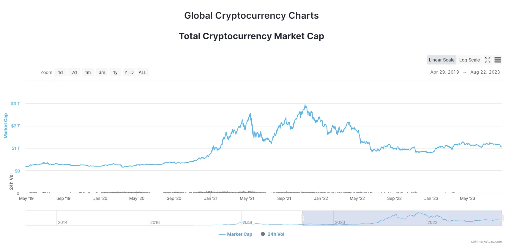 For beginners, the total crypto market cap is one of the best ways to get a zoomed out view of the entire crypto investor space. It is essentially an index that combines every (or most) cryptocurrencies into one combined price. Even though some major cryptos tend to track this index somewhat closely, it is a good way of seeing whether the entire crypto space is in a bull or bear market.