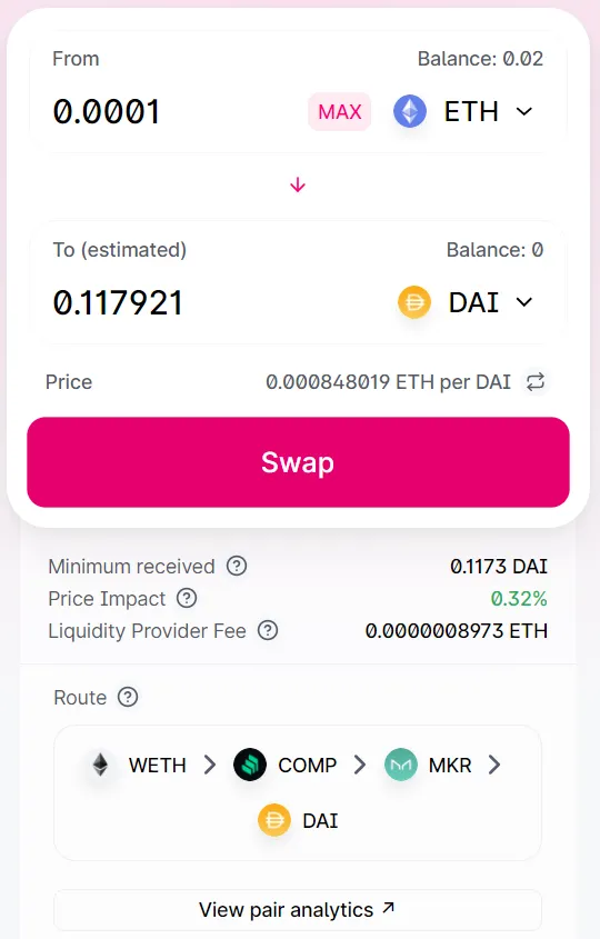 For the purposes of this article, let's keep it simple and exchange 0.0001 ETH for 0.117 DAI. That's the equivalent of $0.117, since DAI is pegged to the US dollar. Do so so, we'll click on swap, then select ETH and DAI from the list. We'll pay liquidity providers—the people who have plonked down pairings to facilitate this transaction—a small fee. And Uniswap has determined that the cheapest way to make this transaction happen is to swap from ETH to WETH to COMP to MKR to DAI.