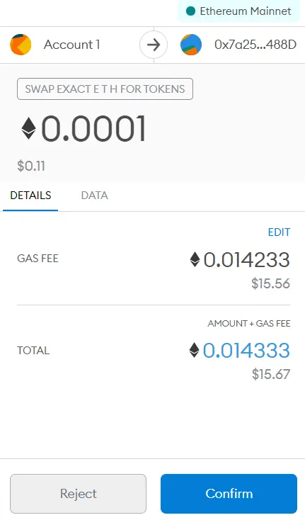 Eek. This transaction costs $15.67, since we have to pay miners on Ethereum to process this transaction. Ethereum's gas fees change all the time. On busy days, they're sky-high. On slower days, they're as low as a few dollars. But, in the name of education, let's confirm this transaction.