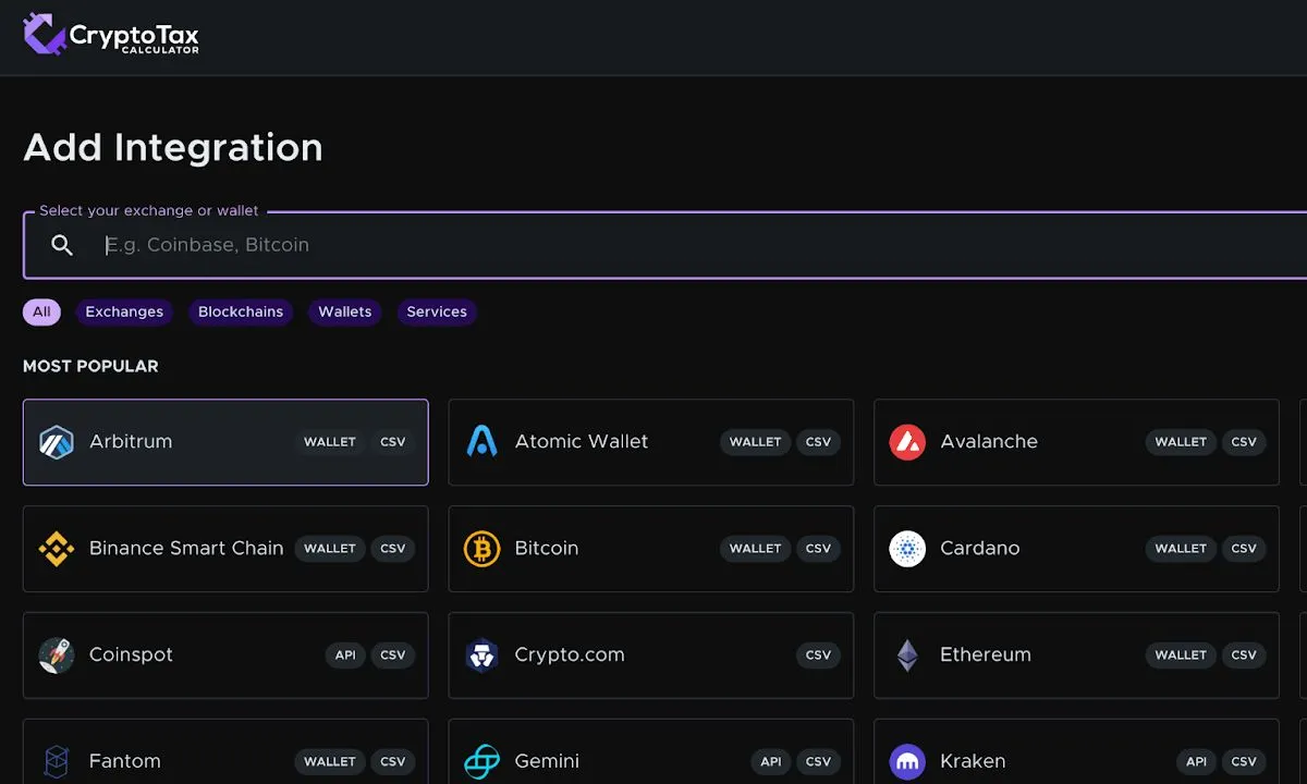 CryptoTaxCalculator has direct integrations with over 100 blockchains, as well as 600+ wallets and exchanges, making importing your transaction data fast and easy. Any on-chain DeFi and NFT activity will be automatically pulled into the platform too.