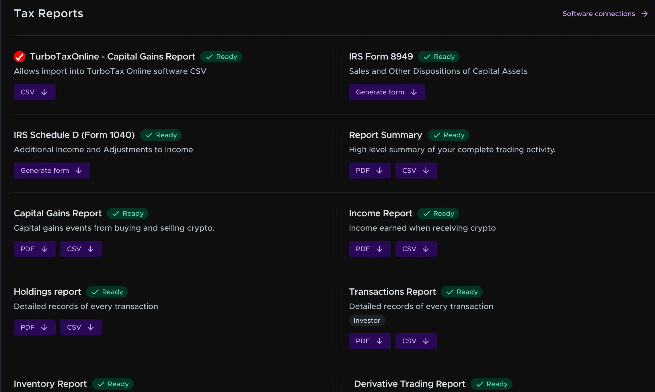 Most crypto tax software companies offer a selection of paid software packages that vary based on what you need. While you can find some of these tools for free, some of the best tools and accounting packages are paid services. CryptoTaxCalculator offers both free and paid plans for all levels of crypto trading activity. While some tax software tools only offer support for basic transactions, CryptoTaxCalculator can handle the most complex crypto transactions you can throw at it, from cross-chain bridging, liquidity pools, lending, borrowing and leverage trading. The platform also offers full support for all NFT types across different chains, and can handle NFT trades, mints and royalties for creators.