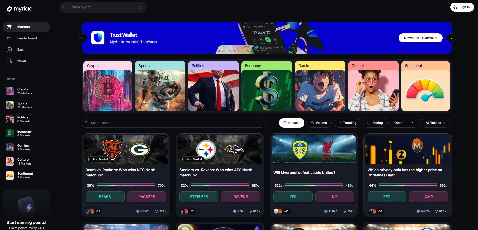 In December 2025, Myriad became the first prediction market to launch in-wallet predictions with Trust Wallet.