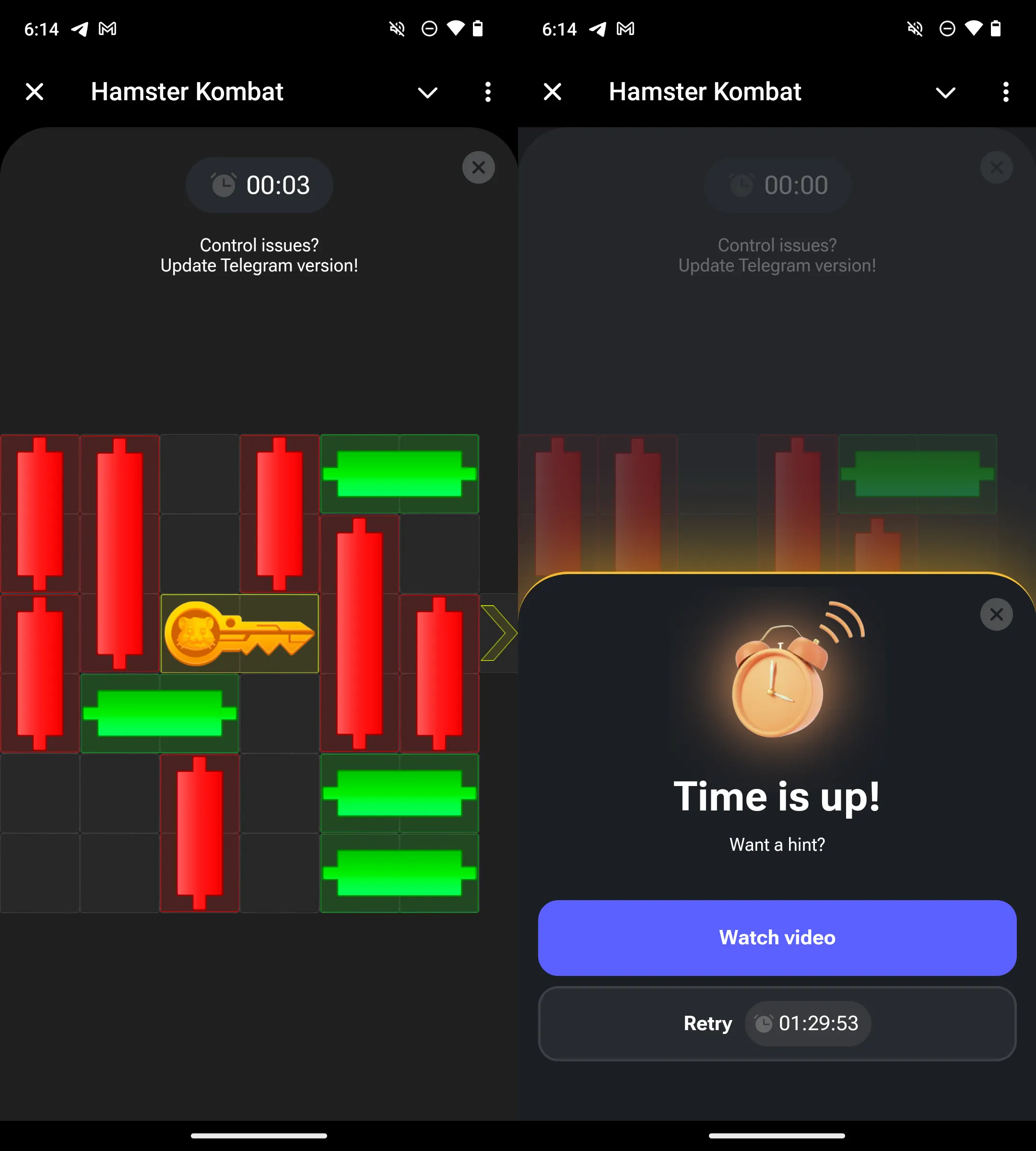 It’s tough! The first couple puzzles have already been challenging, in part because of apparent control issues. Hamster Kombat says to update your Telegram mobile app if you’re having trouble. Also note that the red vertical indicators only go up and down, while the green horizontal indicators can only go left and right, which makes the puzzles even trickier.