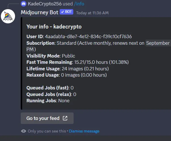 Another useful prompt for beginners is the “/info” prompt that shows your account status. This allows you to see when your subscription will renew, how much “fast” GPU time you have, how many images you have created, and a host of other information.