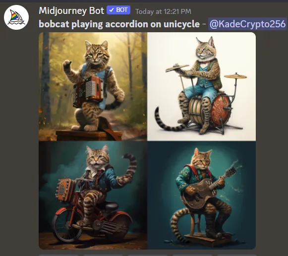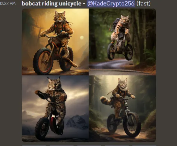 As you can see, the images aren’t quite what the prompts had asked for. While still entertaining, we see that many of the images have a bobcat playing the wrong instrument while most of them have him on a bicycle — not a unicycle. Even with different prompts, we struggled to create the image we imagined. With a little more trial and error (and some Variations), we could probably get an image that more closely resembles what we had in mind.