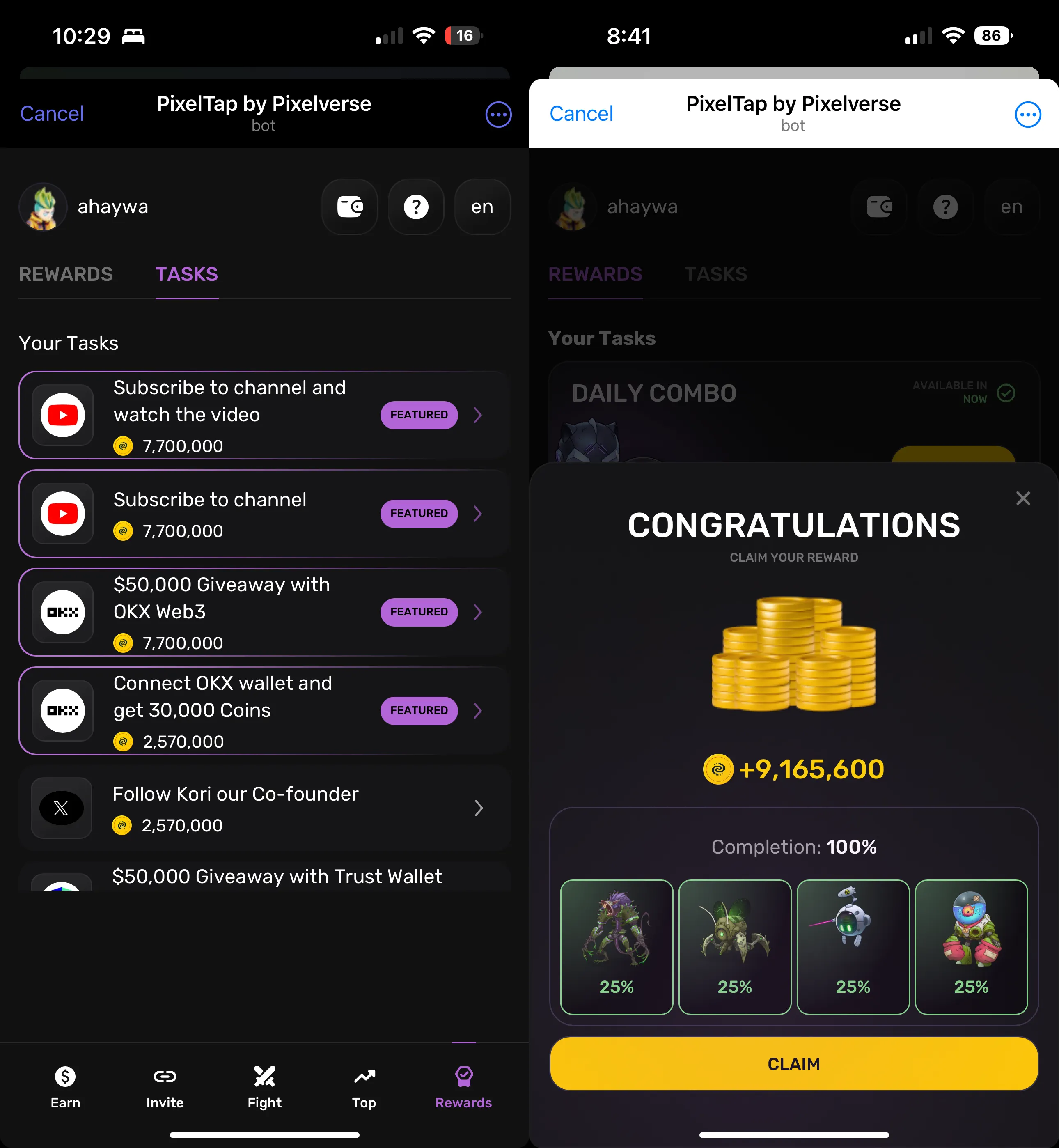 Completing tasks in PixelTap offers an easy way to boost your in-game bag by engaging with social media and Pixelverse partners, and it can really add up quickly.