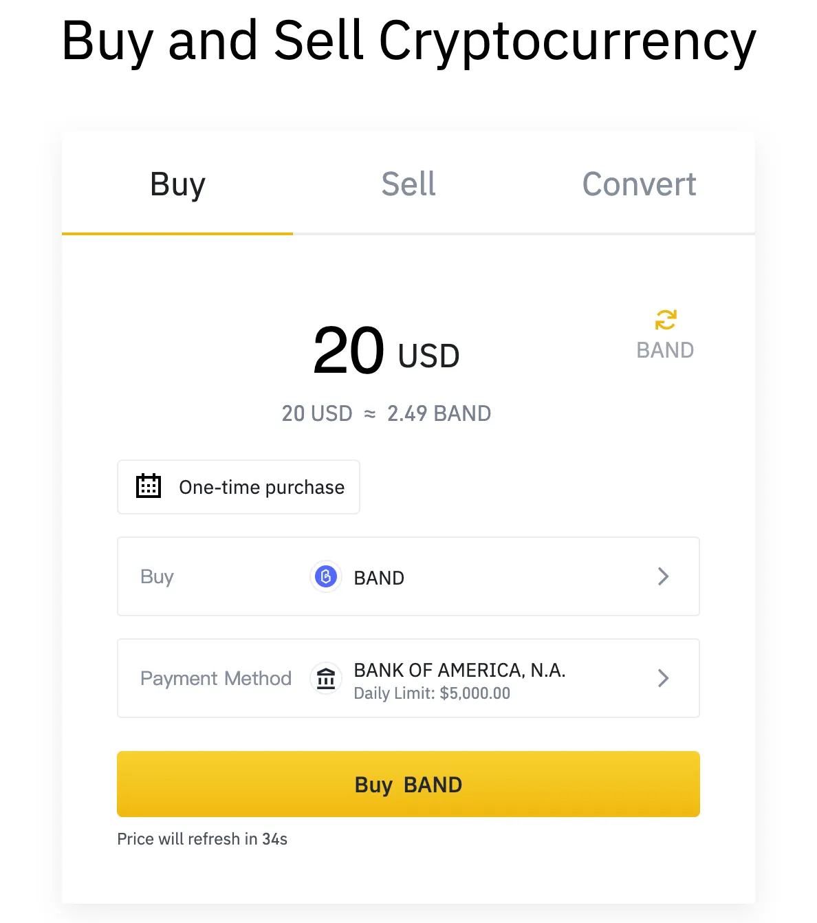 Here is a look at how you can purchase BAND from an exchange, using Binance.US as an example. Simply find BAND on the exchange’s list of supported tokens and then you can choose whether to buy or sell it, or exchange other cryptocurrencies that you hold on the platform.