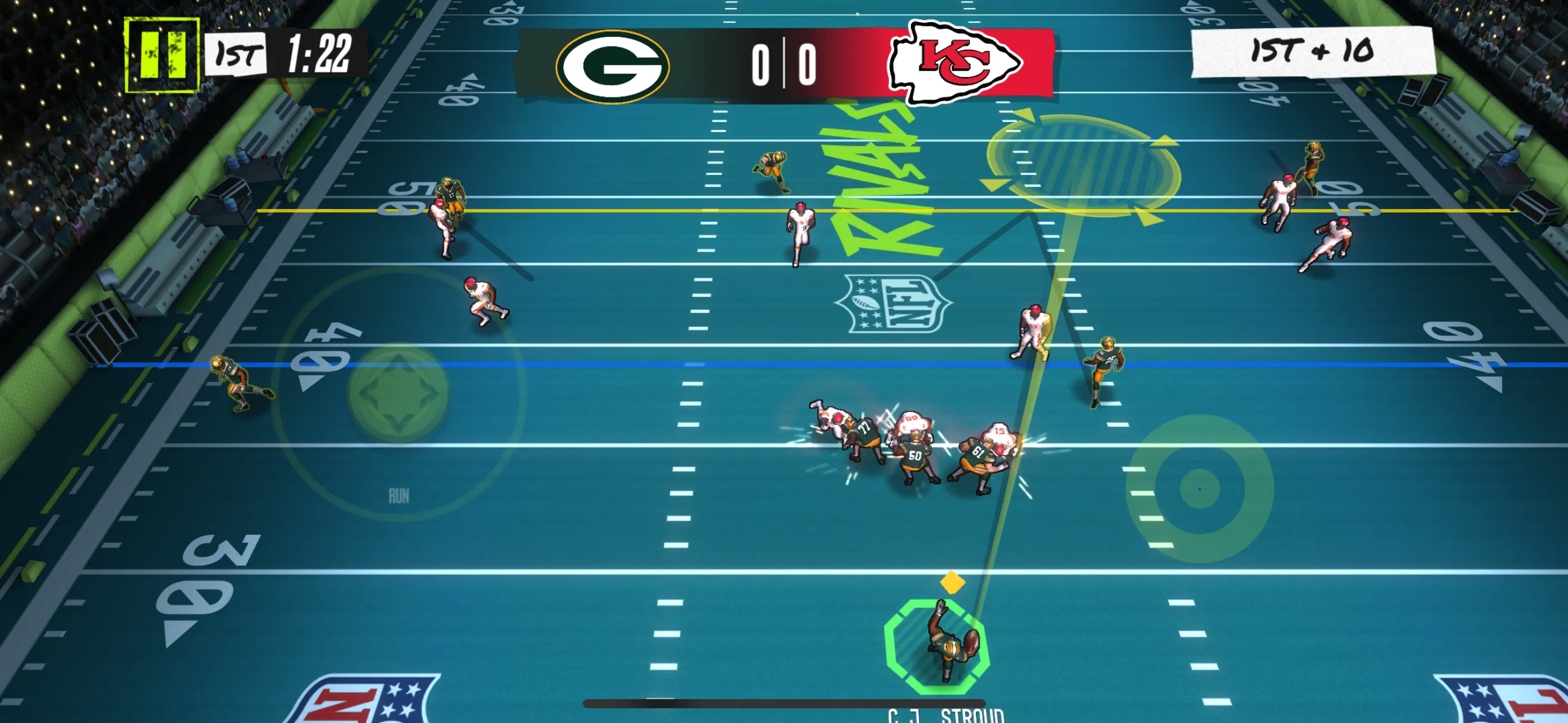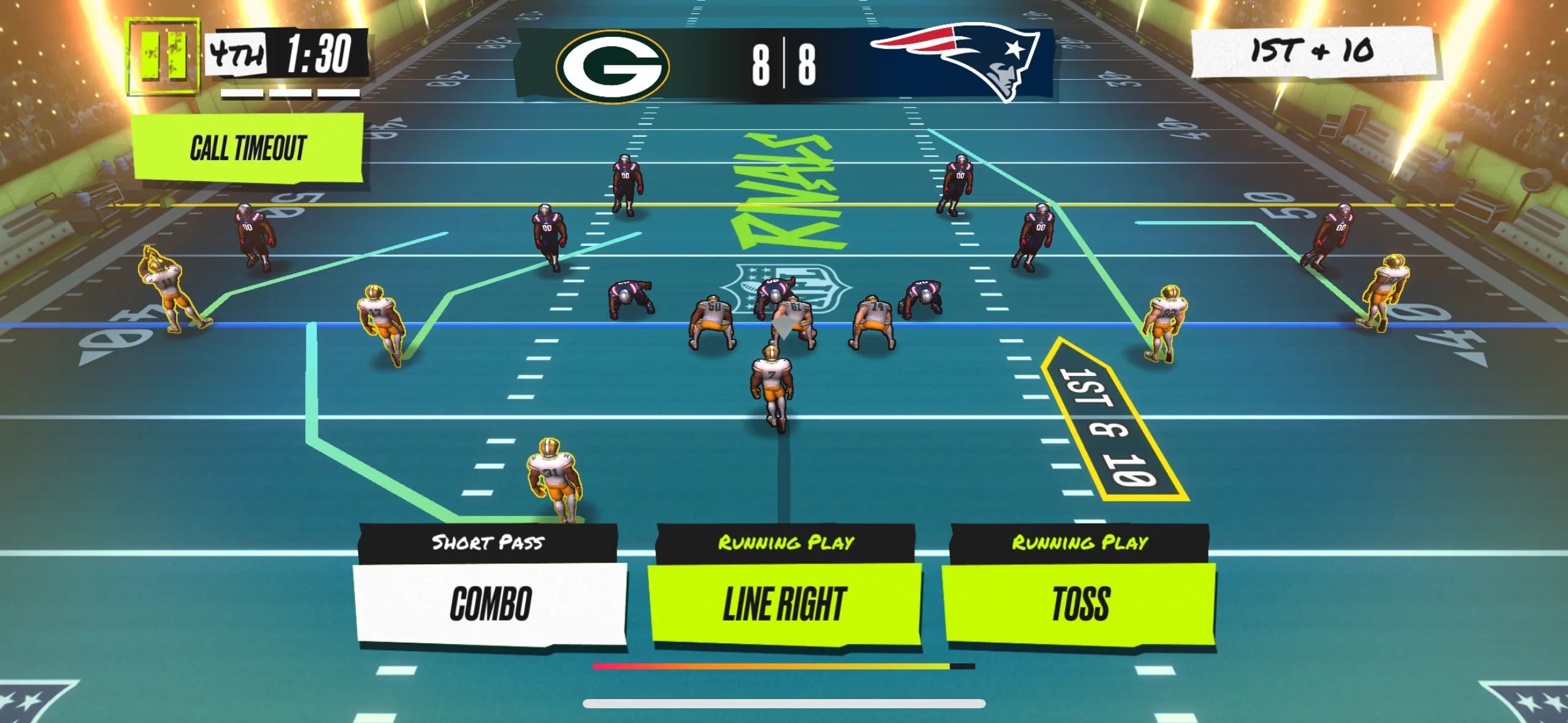 When you get on the field, you’ll only be playing offense—and every snap, you will be given a choice of three plays to run, none of which are particularly complicated. If you select a running play, then you’ll tap the screen to snap the ball, which is automatically handed off to the running back. From there, you’ll use the virtual joystick and buttons to run as fast as you can away from the defenders, even incorporating jukes and dives along the way.