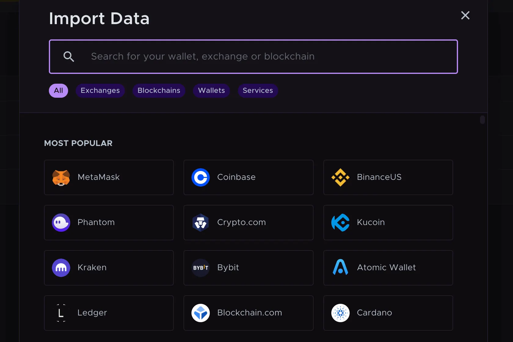Crypto Tax Calculator has direct integrations with over 100 blockchains, as well as 600+ wallets and exchanges, making importing your transaction data fast and easy. Any on-chain DeFi and NFT activity will be automatically pulled into the platform too.