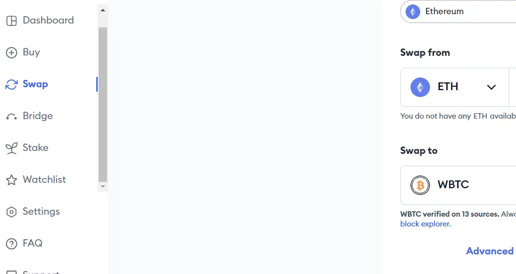 Step 2: Select the currency you are swapping from. This means you are taking an existing crypto holding and exchanging some (or all) of it for another crypto. “Swap to” means the crypto you are receiving (or swapping for) through this process. In this case, let’s execute our wBTC swap first. Select “ETH” to swap from and select “WBTC” as the crypto it will be swapped (or converted) into.