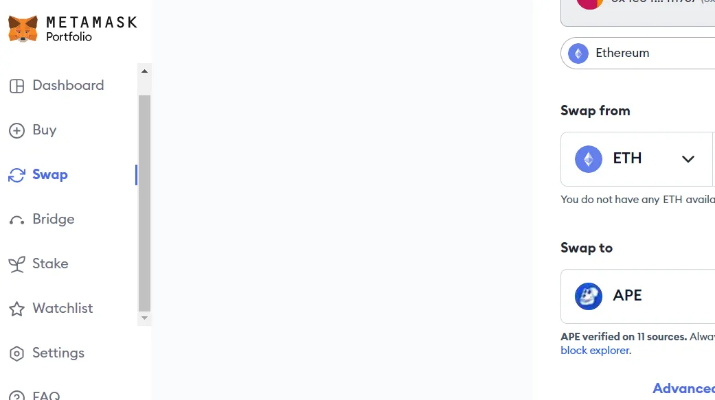 Step 1: On the MetaMask Portfolio homescreen, select the “Swap” option found on the left side of the page.